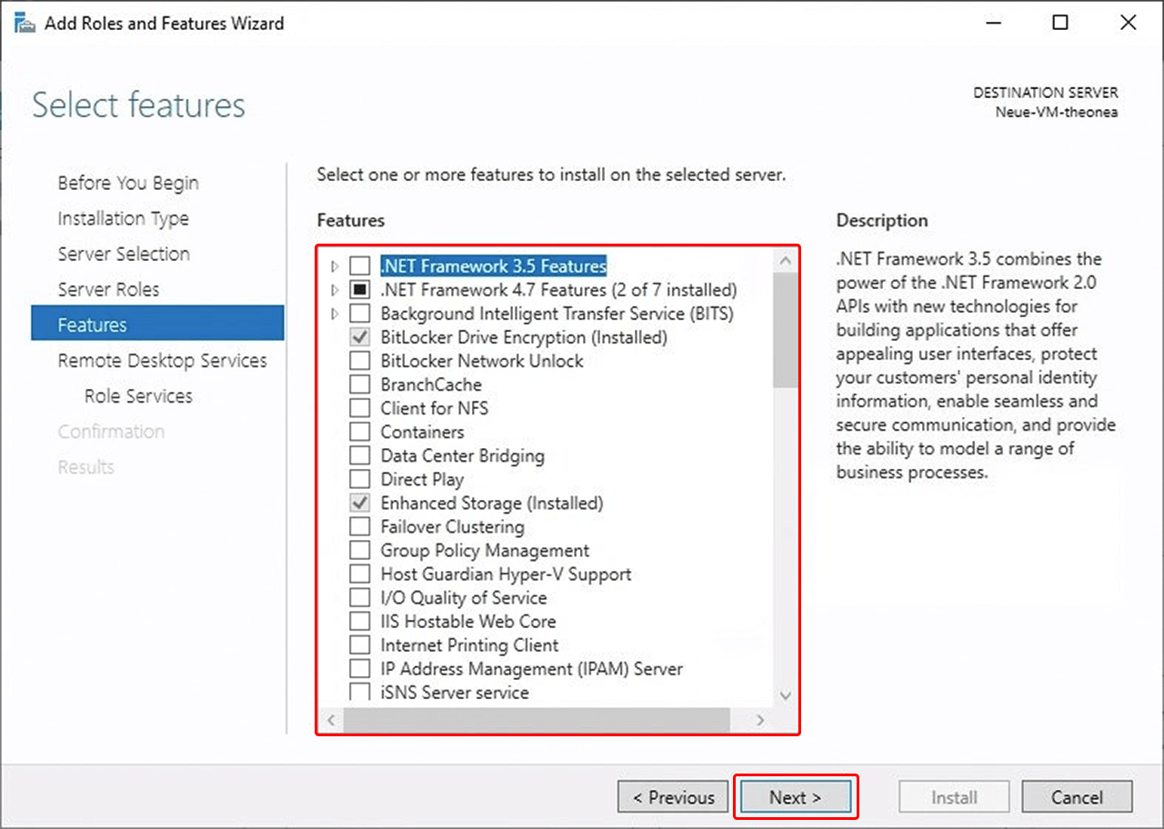- Under "Role Services", check the box next to Remote Desktop Session Host. The wizard opens. Click on Add Features and then on Next.