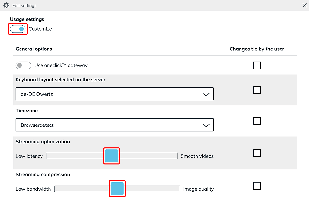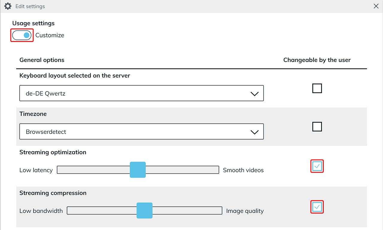 By clicking on the Gear icon, these settings are dislayed to the user. Please note that your users can only see these options if you have checked the “Changeable by the user” box under “Streaming optimization” in the usage settings of the app configuration, previously.