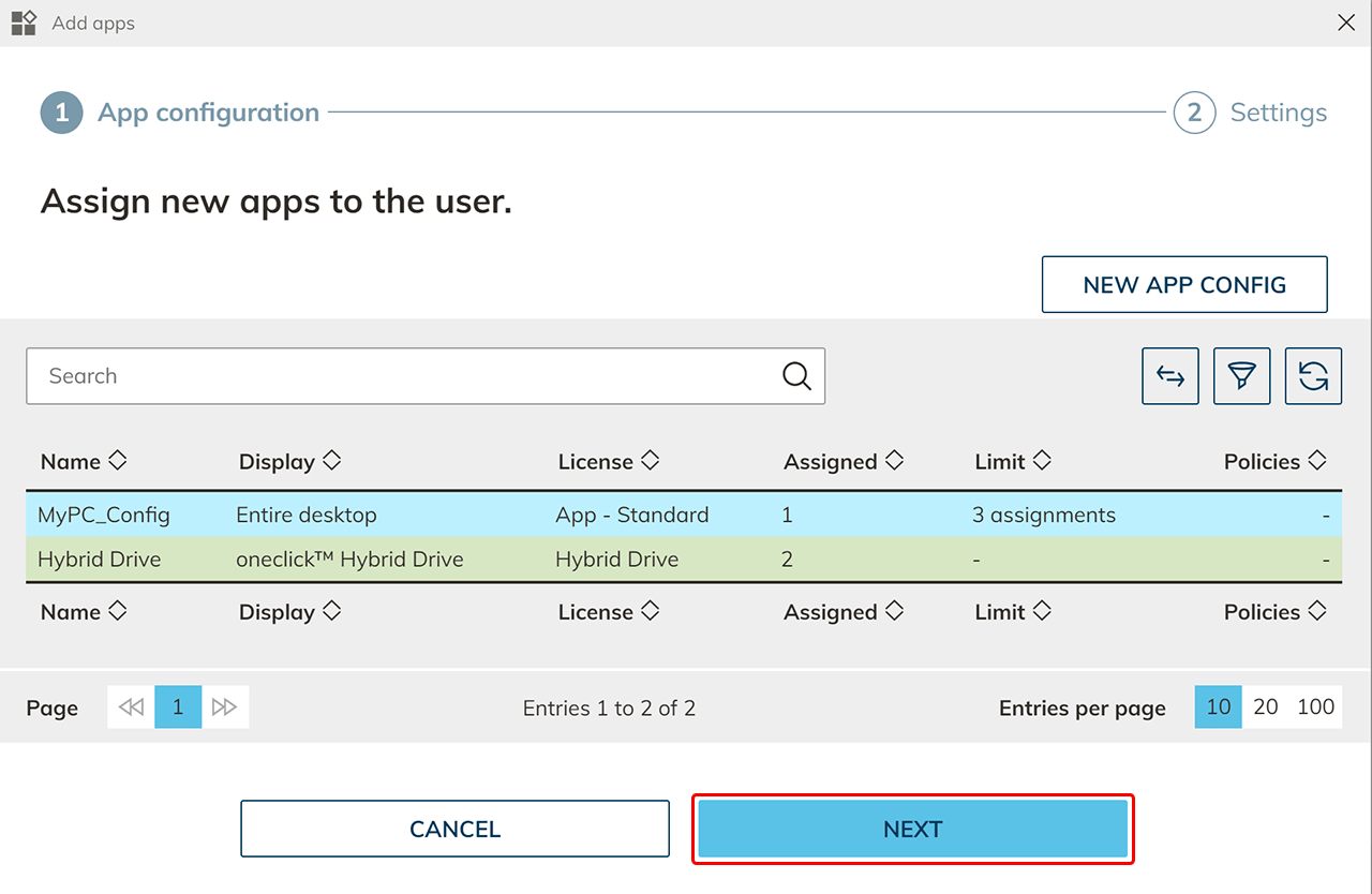 Select the app configuration from which you want to create an app instance and click Next. The app license is stored in the configuration, which determines how often you can assign the app configuration.