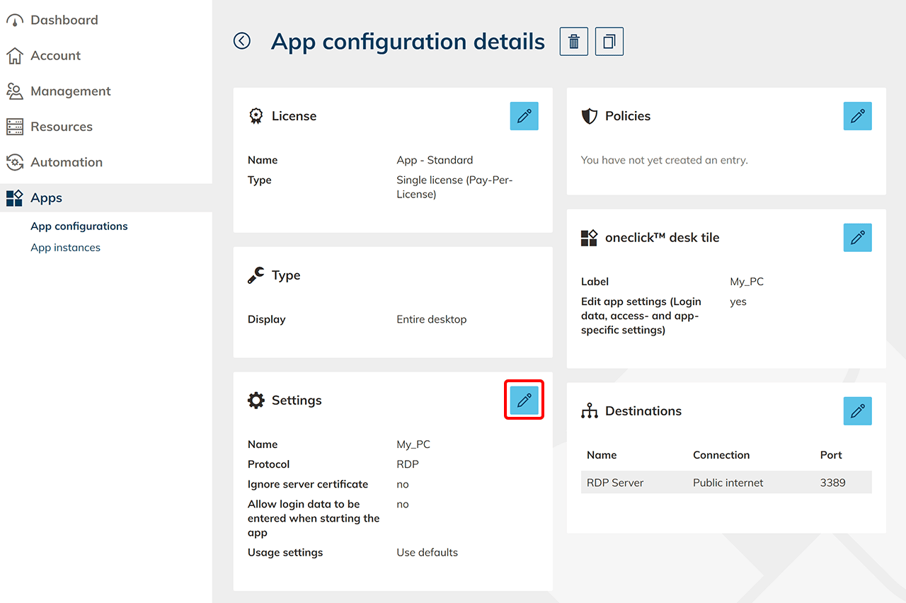 To be able to make the following settings, you must already have created a user license, a user, an app license, cloud resources or on-premises resources you want to connect to, and an app configuration.