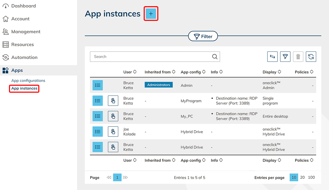 Click App instances in the Apps menu. Click the + icon to create a new app instance.