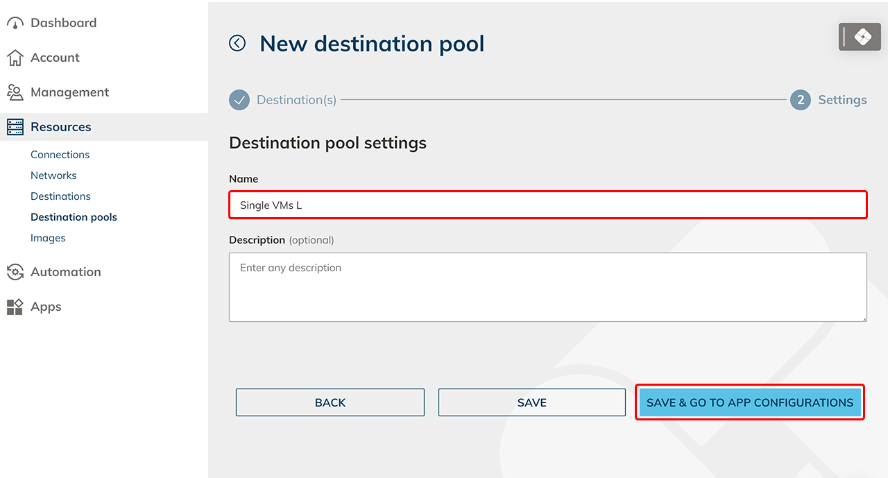 - Give the new destination pool a Name of your choice then click Save your entries.