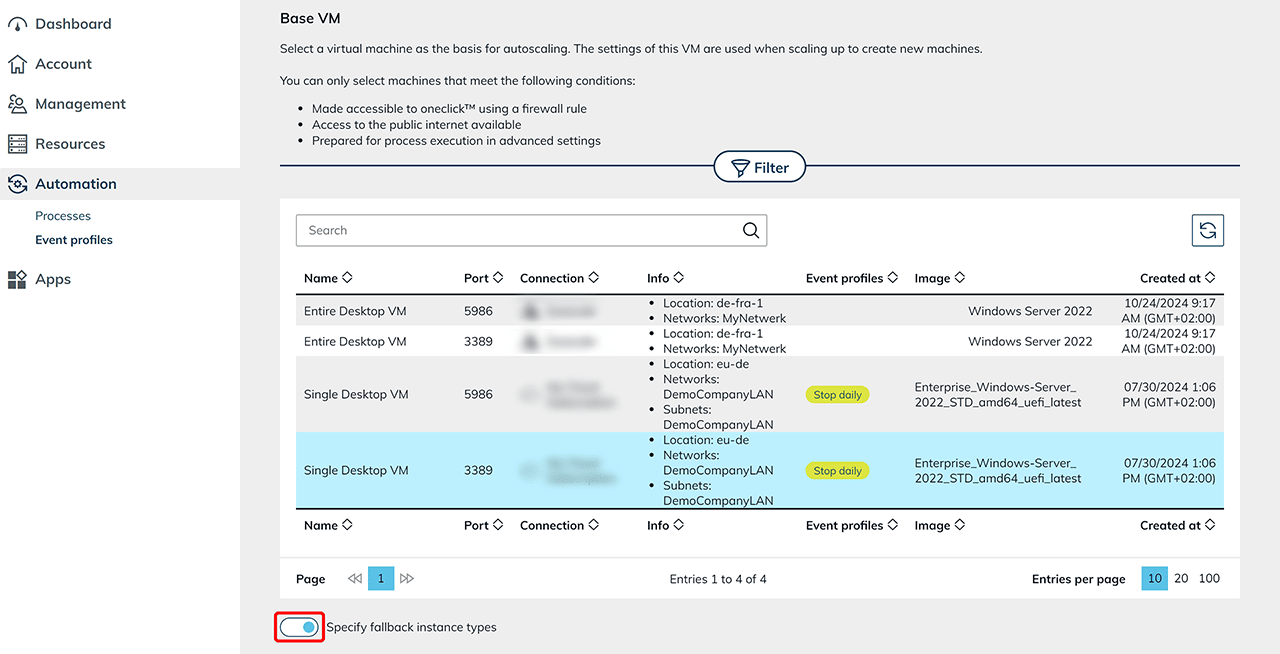 - Decide on a base VM on which you want to run autoscaling. All VMs used for scaling in the future are clones of this base VM. Depending on the provider, you have the option of using alternative types of instances. This ensures that your VMs continue to run smoothly even in the event of resource bottlenecks by using alternative instance types automatically. Types of Fallback instances Activate the switch if you want to set up any types fallback instances. This function is available for the providers Open Telekom Cloud, Orange and Huawei. It enables the use of alternative instance types if the standard instance type is not available in sufficient quantity.