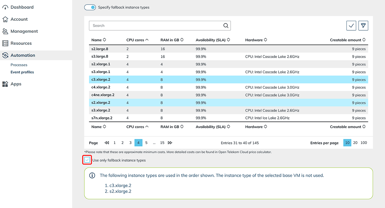 Select the desired fallback instance types from the list of available options.If you want to use fallback instance types only, activate the corresponding option by ticking the box. This ensures that only the fallback instance types are used, even if the original instance type is available. The instance types are used in the order as shown in the list below.
