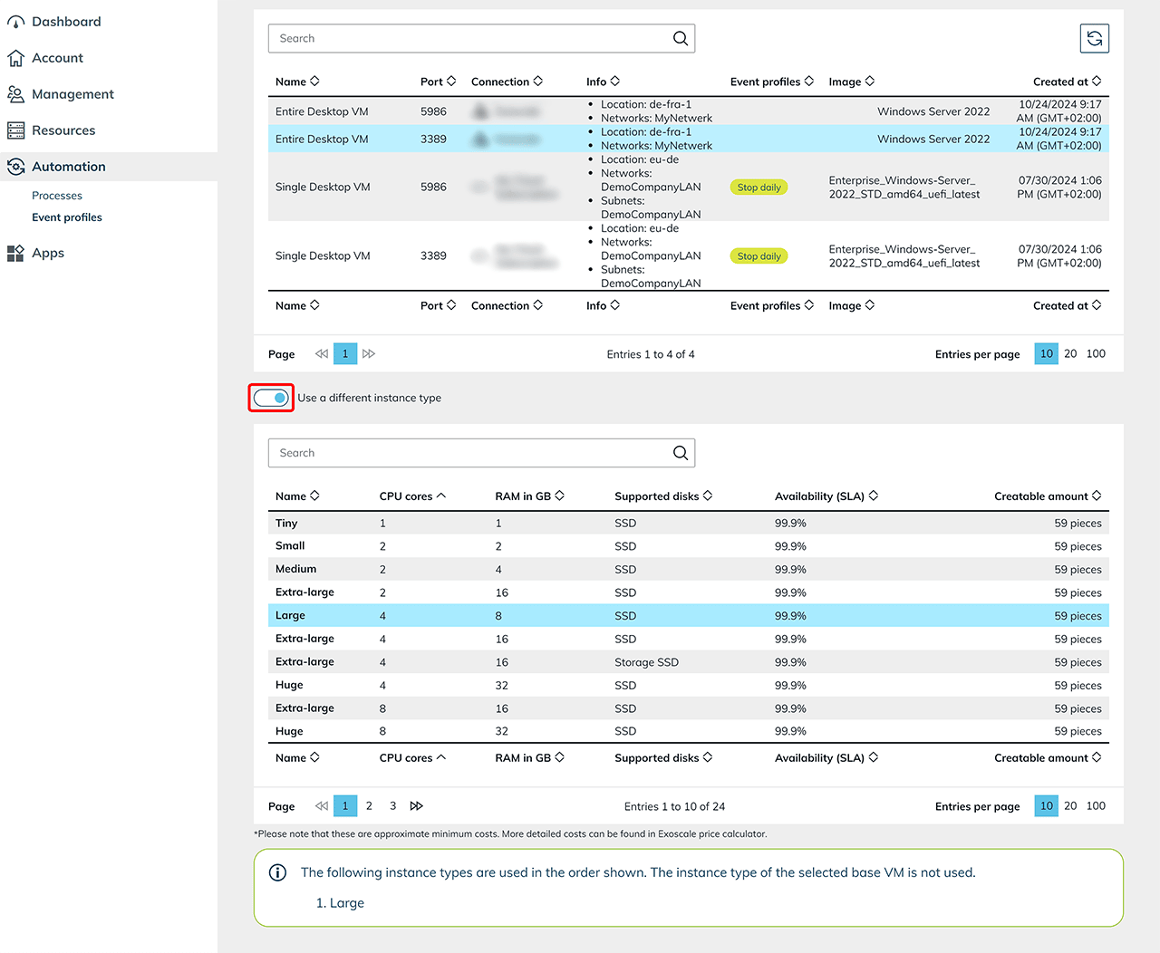 Deviating instance type For other providers, you have the option of defining a different instance type that is used instead of the basic VM instance type. Activate the switch and select a suitable alternative from the list of supported instance types.
