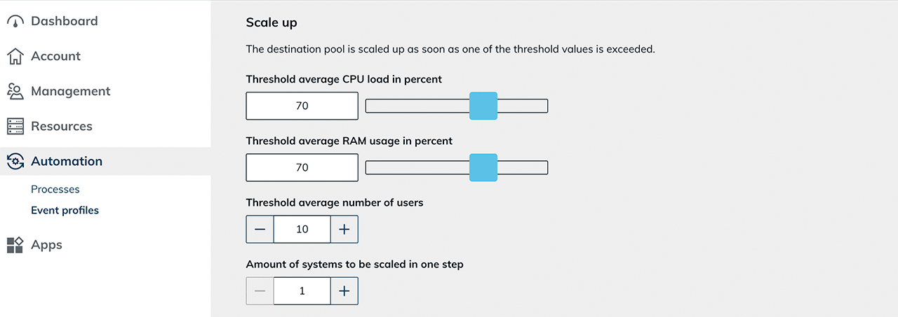 Select a limit for the average number of users. If this value is exceeded across all servers, the system scales up. In this case, the system will create additional VMs.