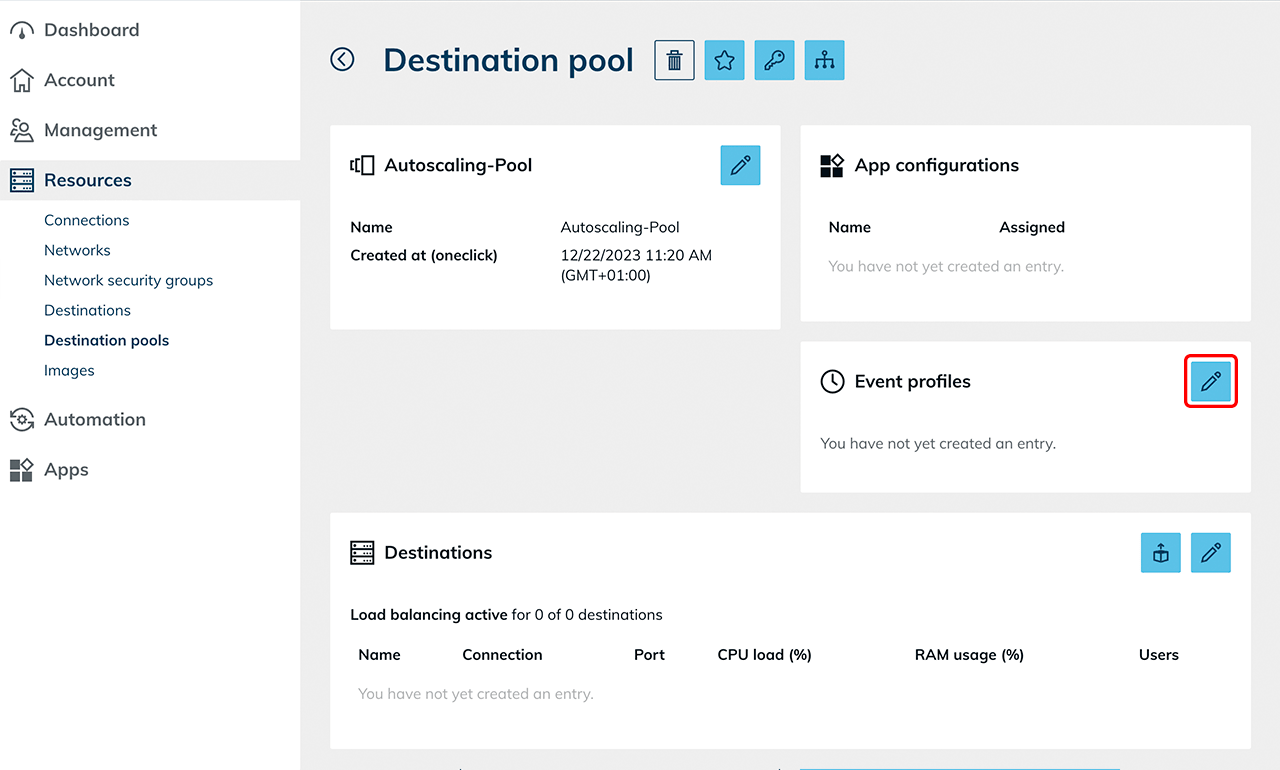 The load balancing, as well as active event profiles, will be displayed in the settings of destination pool.