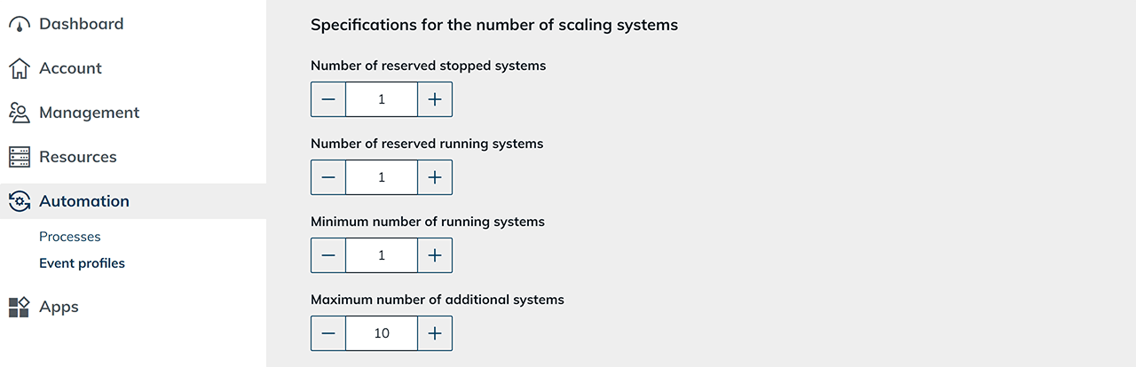Specify the number of systems to be scaled in one step. If the value 1 is set here, for example, exactly one VM is always created before the system is responding to the new conditions.