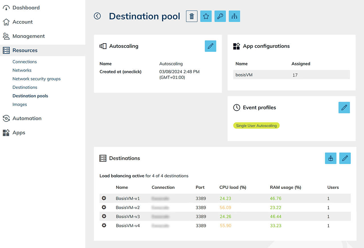 - If a user wants to work independently from autoscaling, to run calculations overnight for example, you can clone your base VM manually and add it to the pool. Then assign your manually added VM to this user through the app instance. All manually added VMs will not be taken into account during autoscaling.