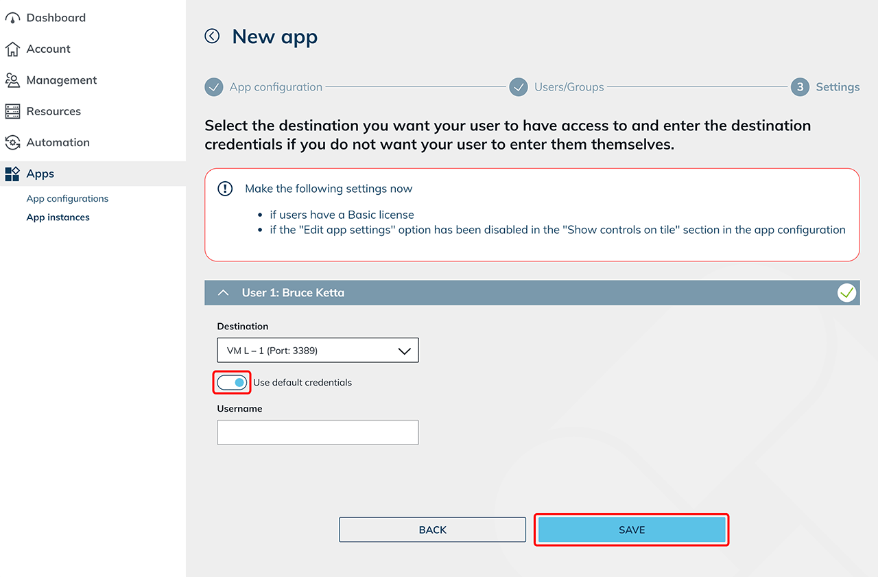 - ... and then create app instances for your oneclick™ users. When creating the app instance, you can see whether default access data is stored. Leave the slide switch activated in the settings if you want your users to use the default login data. Depending on the stored default access data, only the empty input field that has not been prefilled is displayed. If no field is displayed, all login data is already stored.