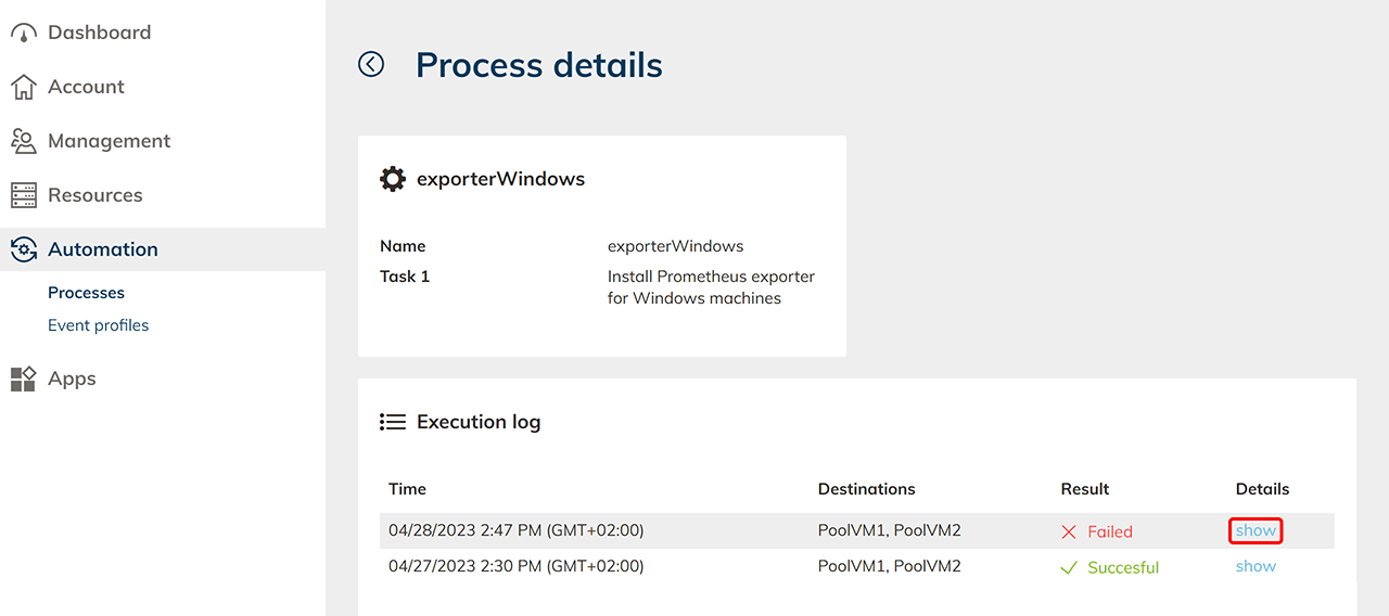 - Was the “exporterWindows” process executed successfully? To get more information about the cause you can view the process history as follows: