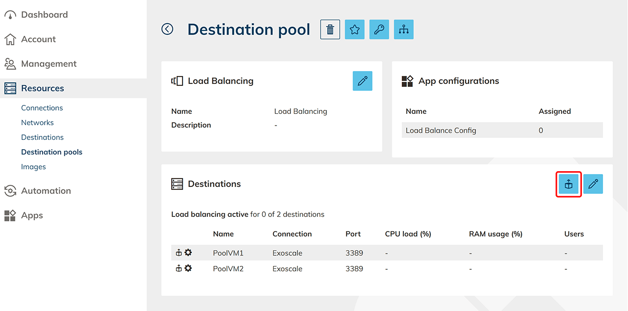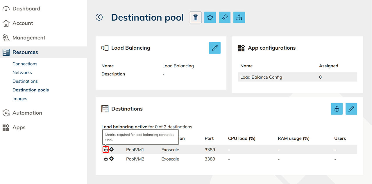 As soon as you have activated load balancing, a new process is automatically created in oneclick™, which activates the Windows Exporter. If the initialization of the load balancing has failed, a Box-symbol appears to the left of the destinations’ name in the list of destinations.