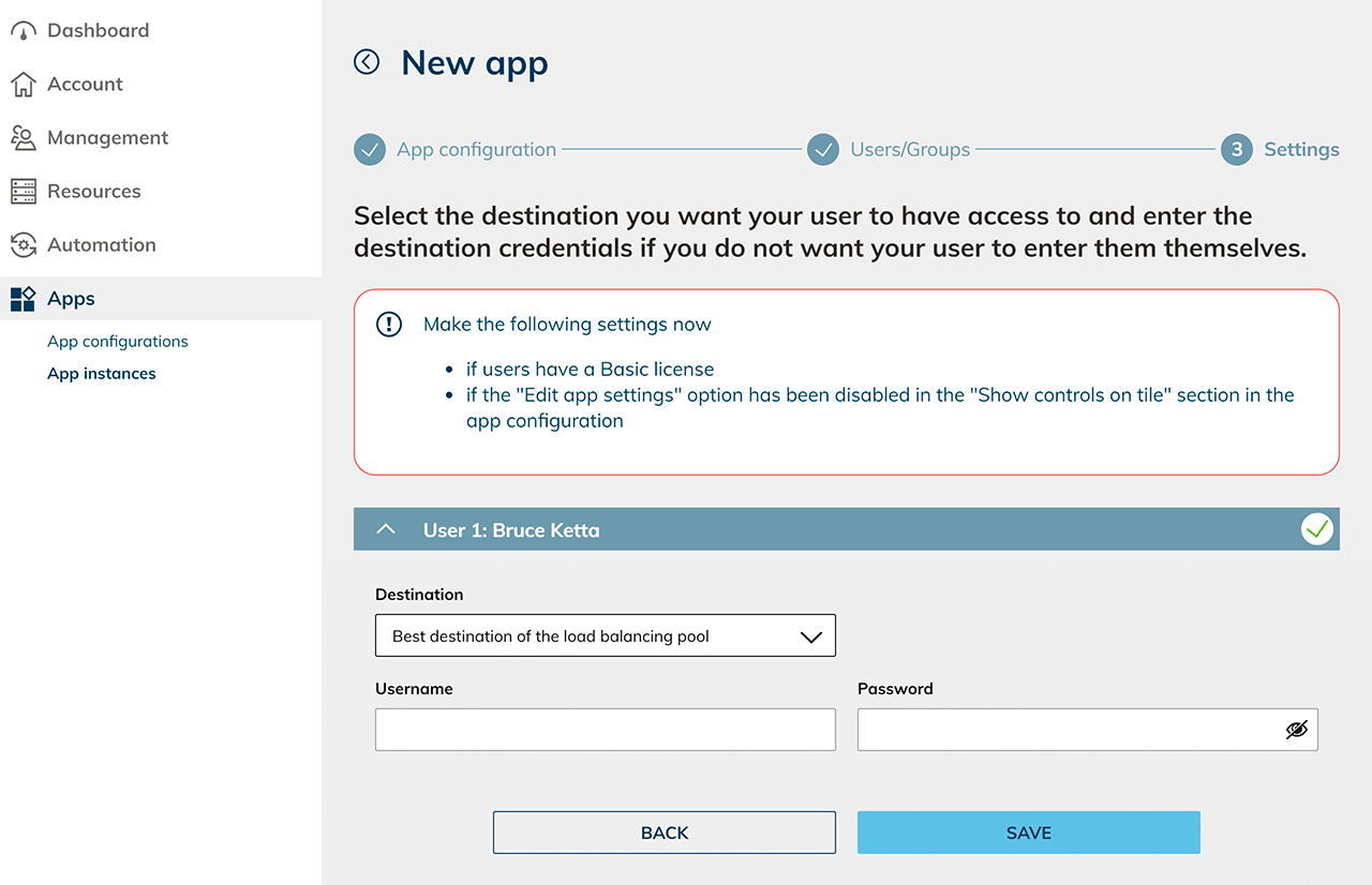 - Then create app instances for your users. During setup, you can now select the entry “Best destination of the load balancing pool” instead of a single destination under “Destination”.