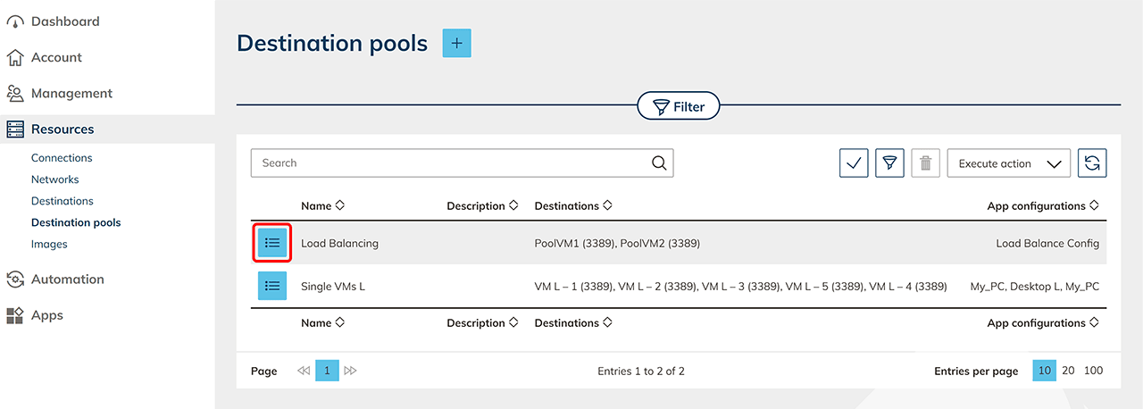 From the Resources tab, select the Destination pools subitem and click the List-icon to go to the details page for your resource.