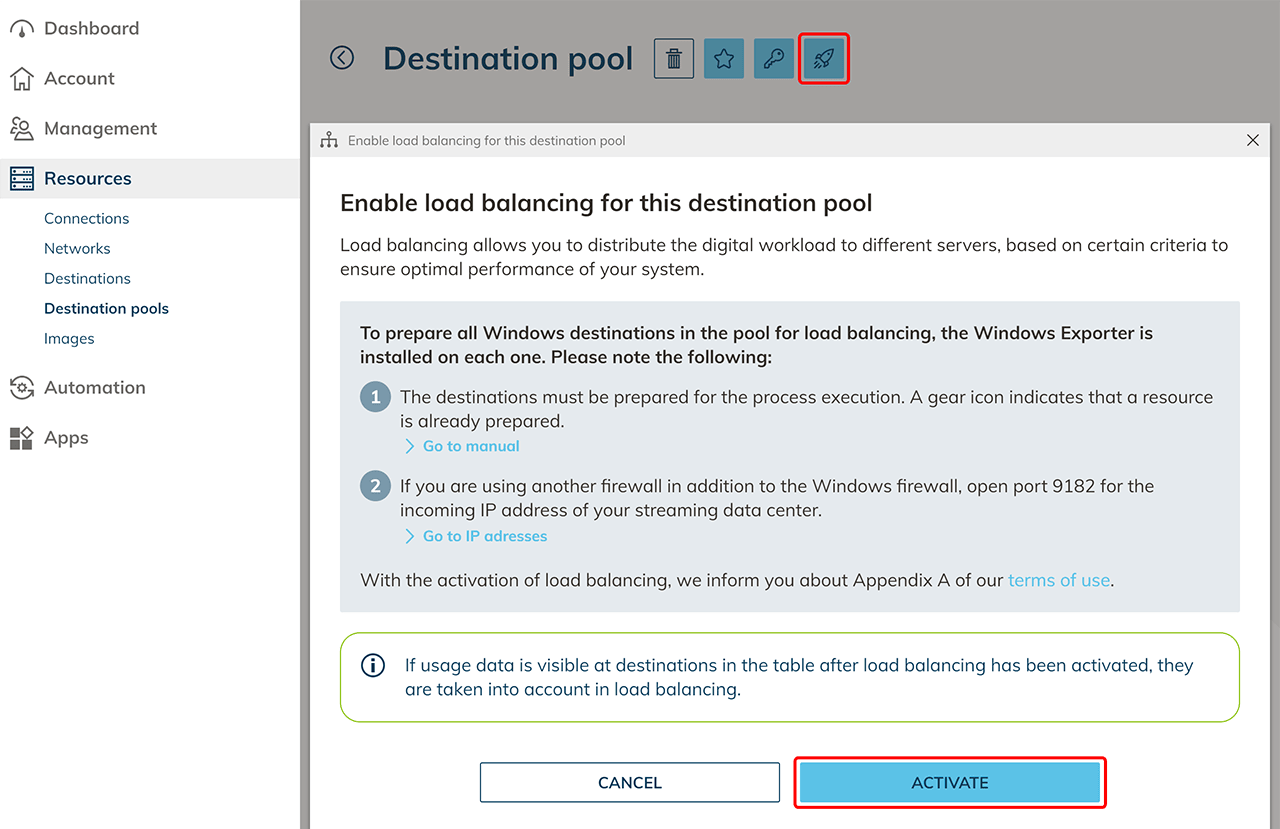 Follow the instructions and Activate load balancing for this destination pool. If you already performed step 1 and 2 above, you can continue directly at this point.