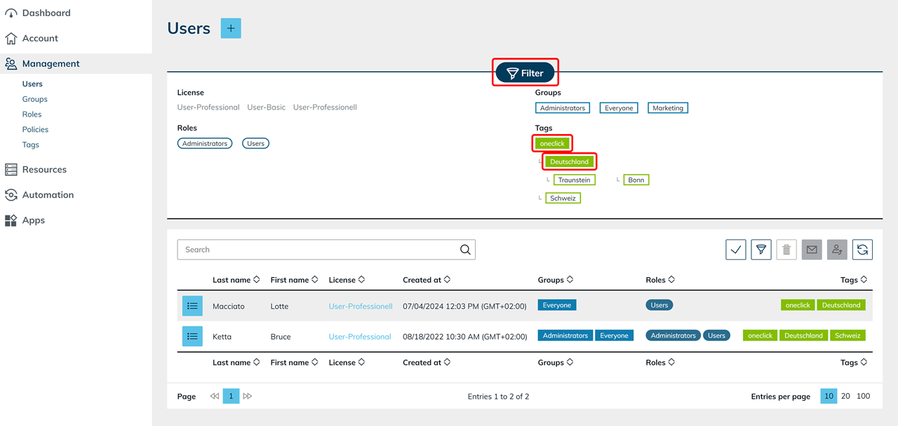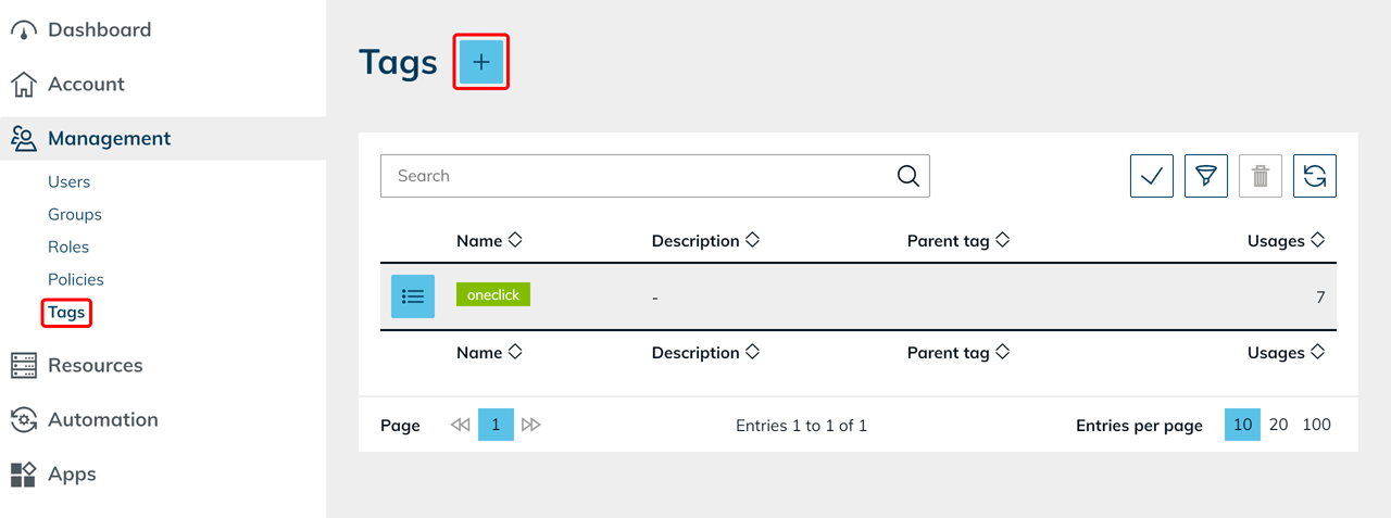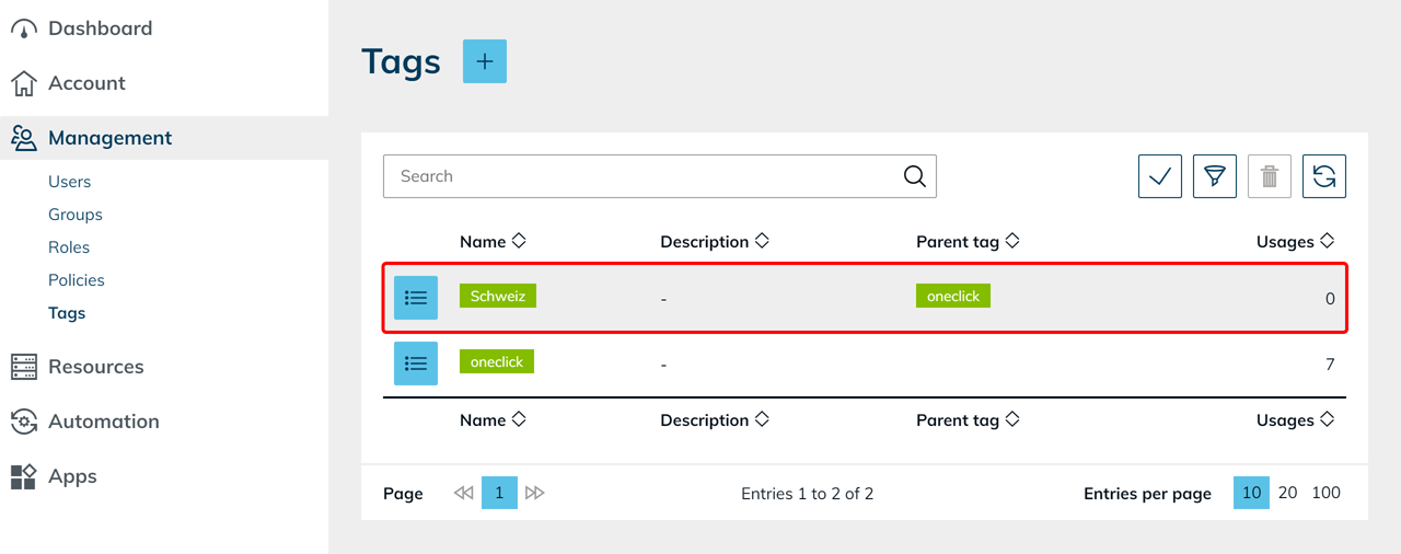 Tags are used in the areas Account, Management, Resources, Automation, and Apps to organize objects clearly and identify relationships more quickly.