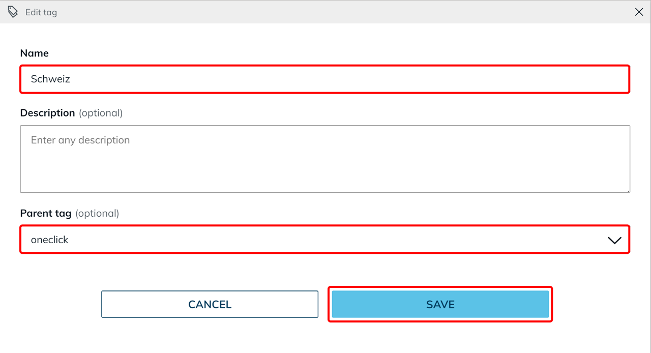 - Optionally select a parent tag to classify the new tag as a subordinate tag (child tag).