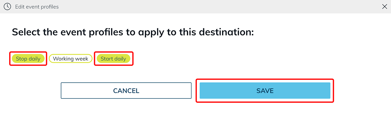 In an event profile, you can create several events and apply them to your resources.