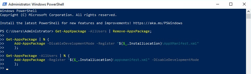 Add-AppxPackage -Register "$($_.InstallLocation)\appxmanifest.xml" -DisableDevelopmentMode