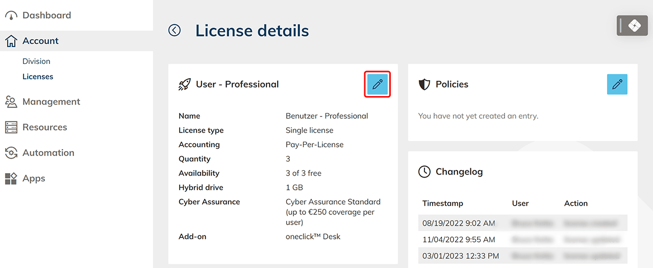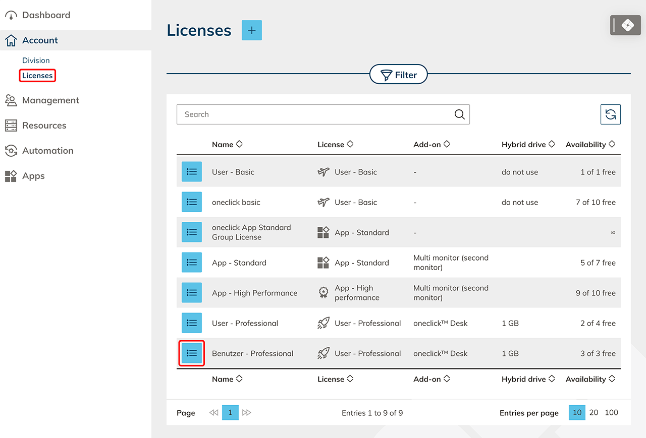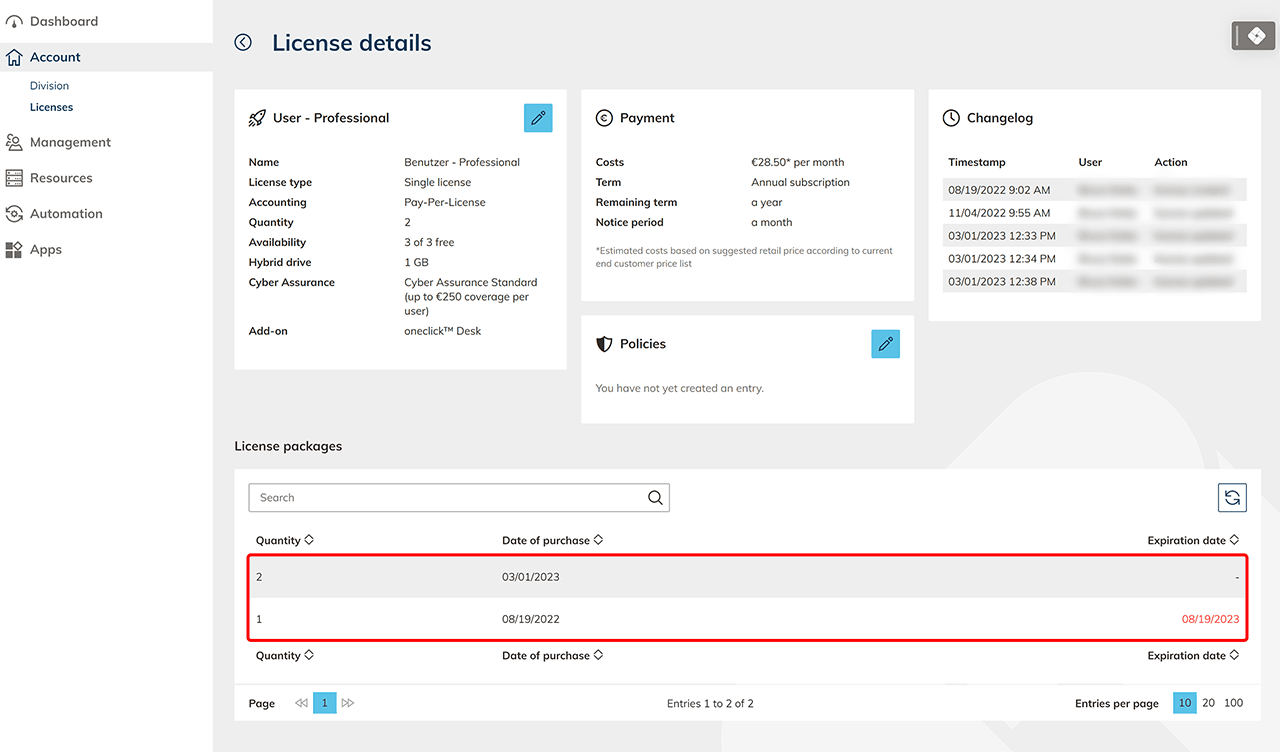 You are now shown different license packages, so that you always have an overview of when how many licenses run or expire.