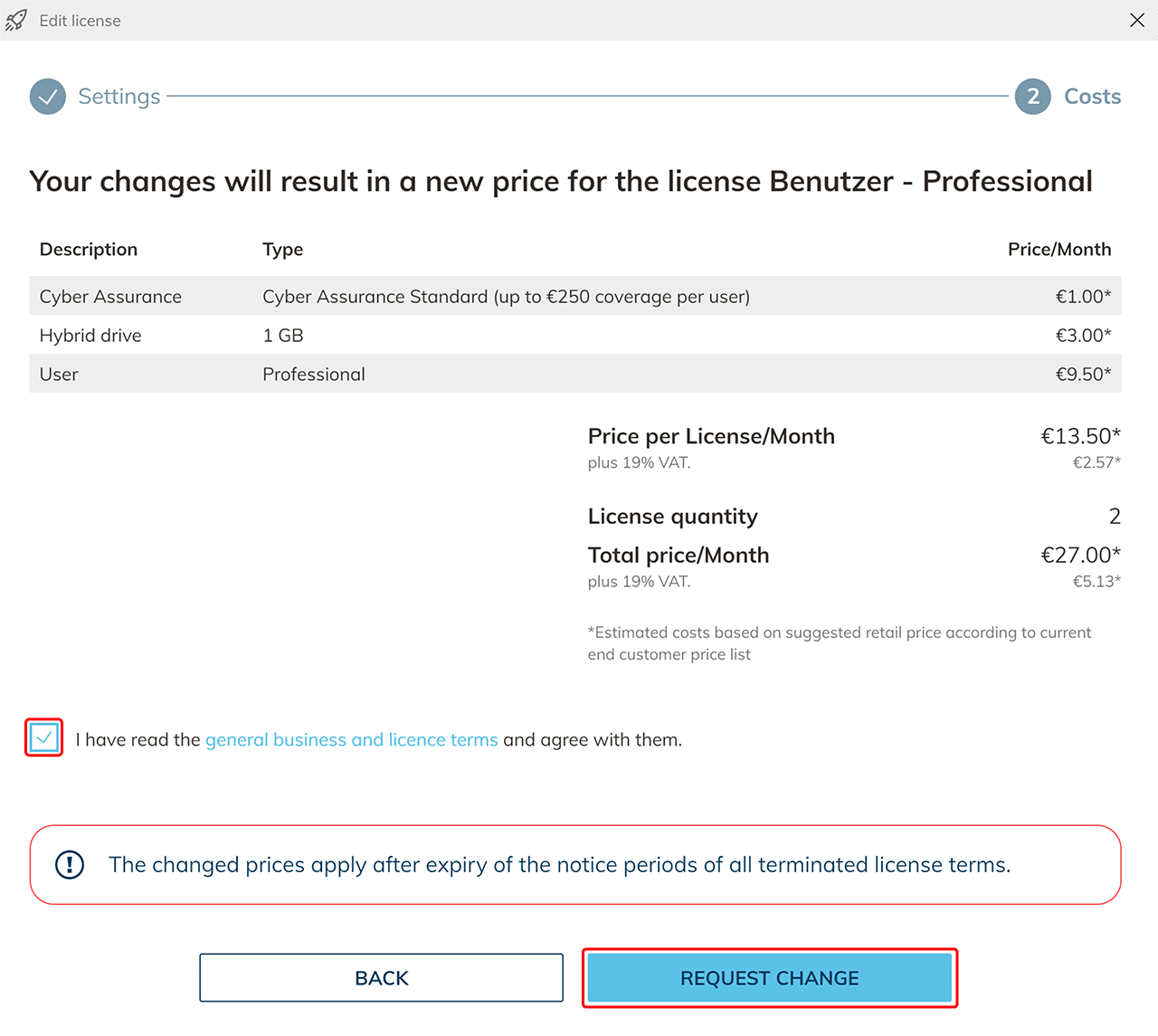 - Terminate a license Decrease the license package quantity by hitting the Minus icon and click Next. The changed prices apply after the expiry of the notice periods of all terminated license packages.