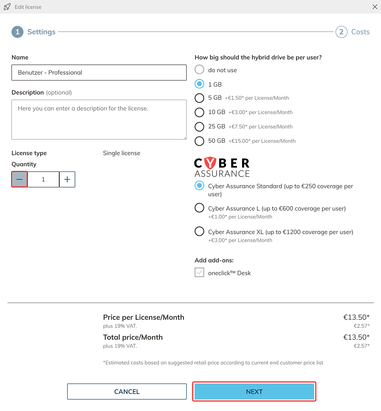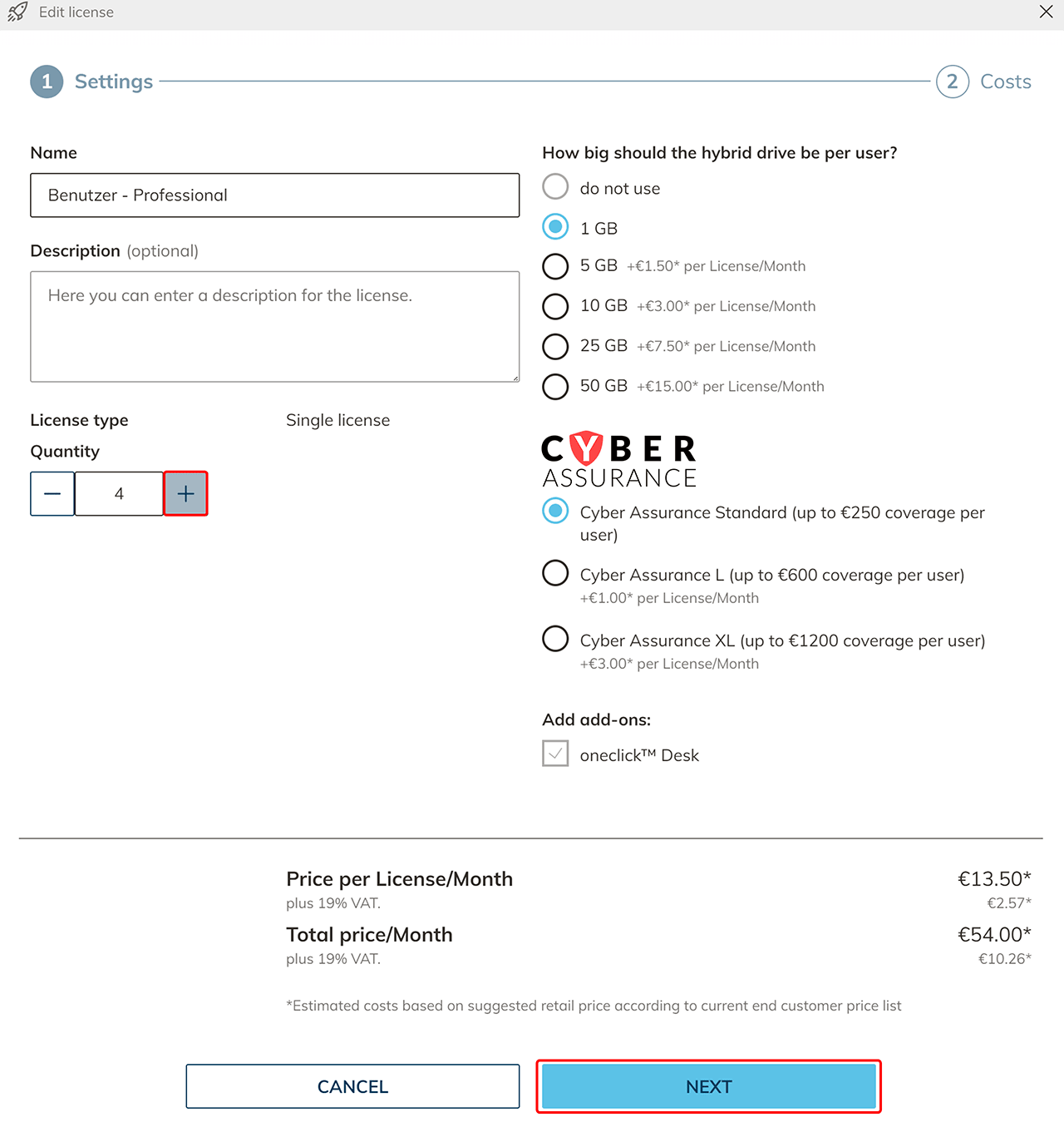 - Add a license Increase the license package quantity by hitting the Plus icon. Then click Next.