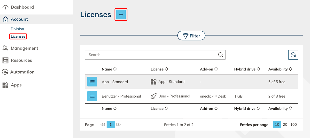 In the Account tab, click on Licenses and then on the + Icon to create a new license.