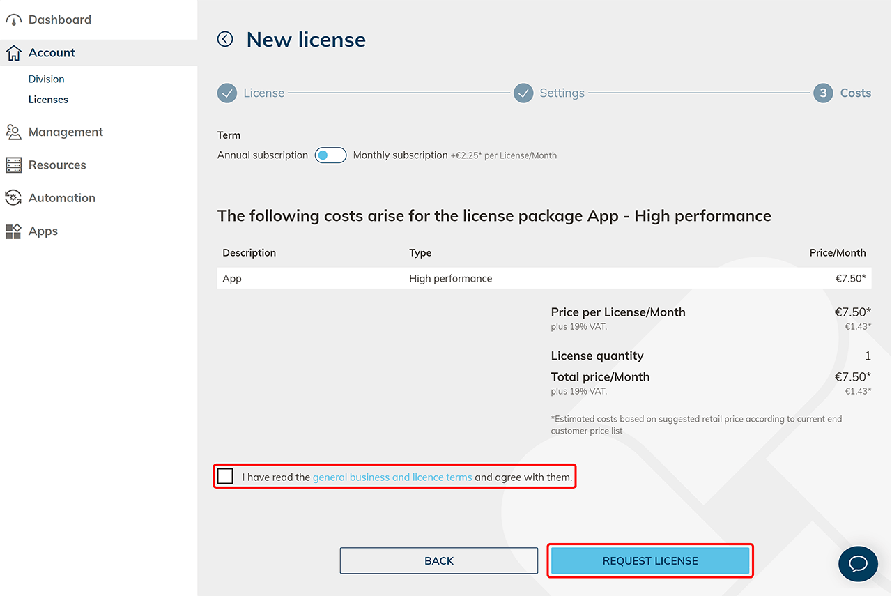 In the last step, you will receive a detailed list of all costs. Click on Request License to complete the process.