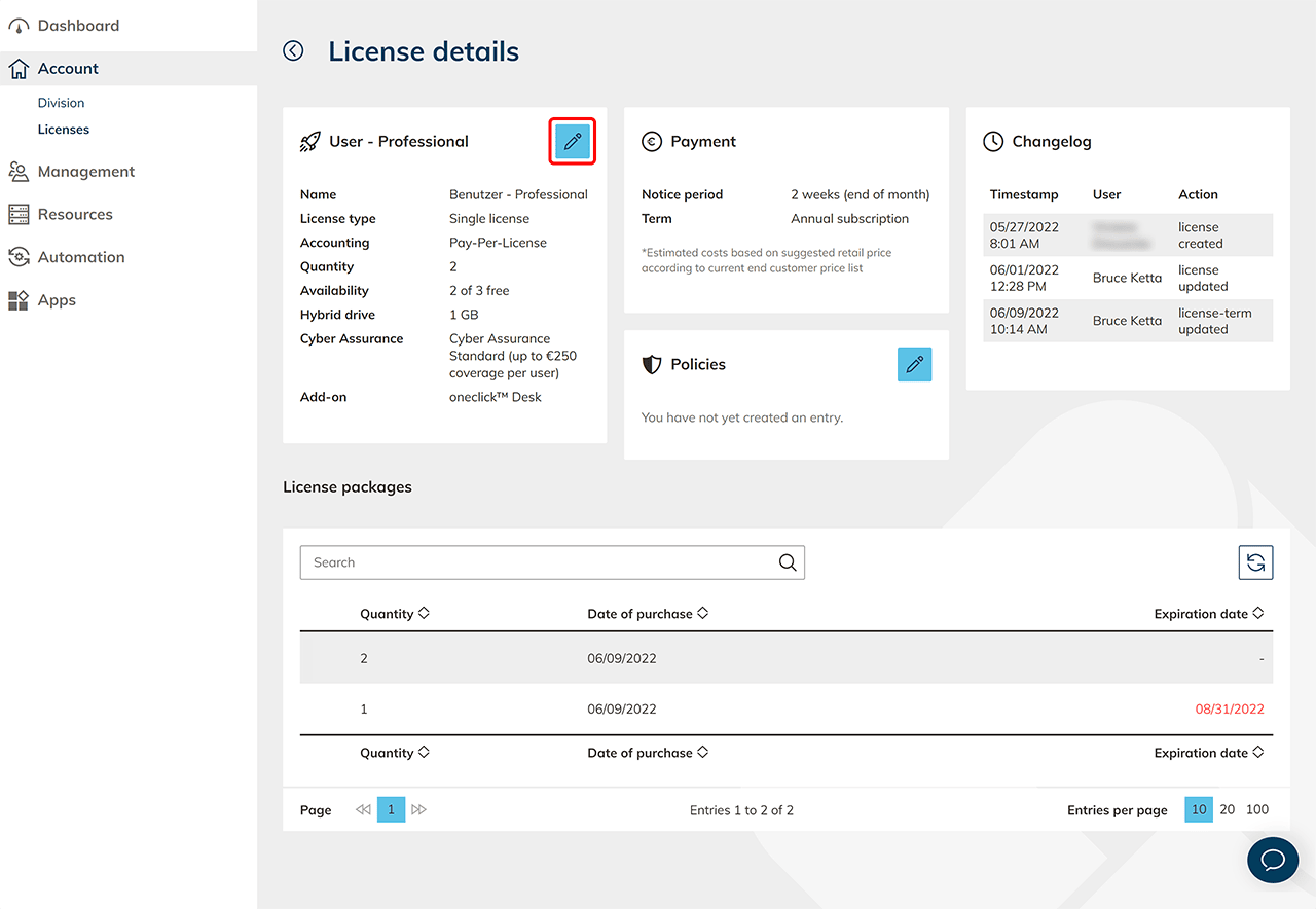 - The "License packages" section lists how many licenses are cancelled and when they will expire. Clickon the Pencil icon to change the quantity of your licenses.