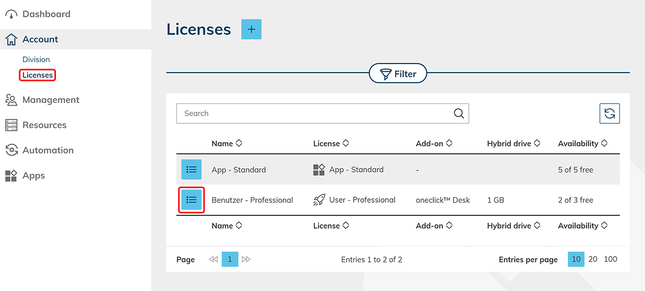 - Go to the detail page of the user license for which you wish to increase the storage. You reach the detail page by clicking on the List icon .