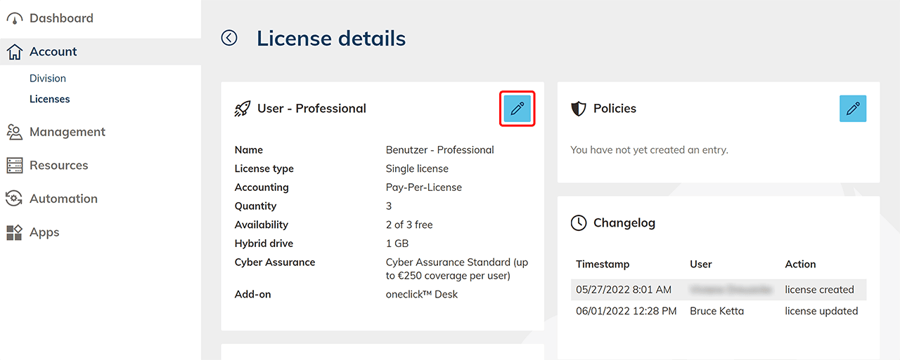 - In the tile with the name of the license, click the Pencil icon to edit the license's details.