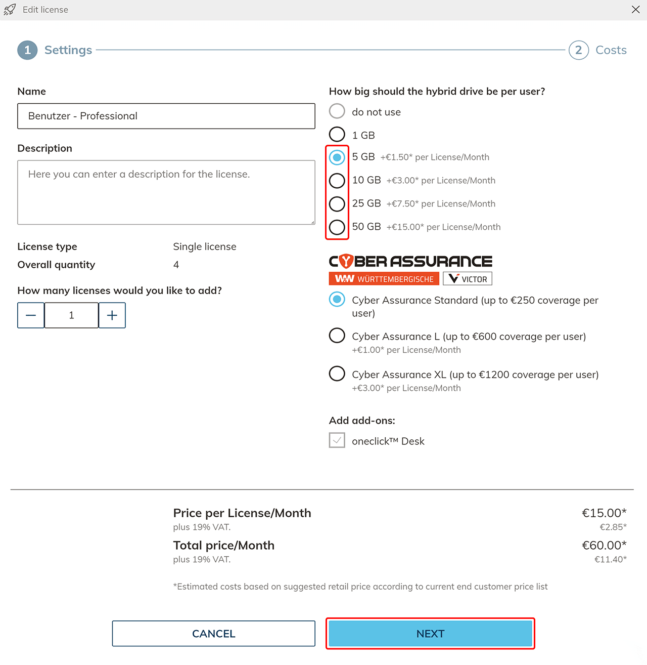With an existing user license, it is only possible to increase the storage of the hybrid drive in oneclick™, but not to reduce it. If you want to reduce the memory, you must cancel the license you have already purchased and create a new license. Please contact Support if necessary.
