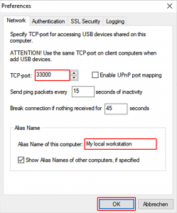 - In the Network tab, enter a name under "Alias Name of this computer" under which you recognize your end device and the value "33000" for "TCP port". Then confirm your entries with OK.