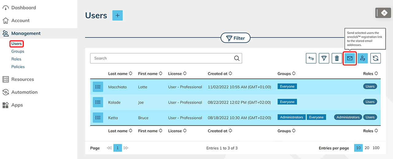 - Select the corresponding users by clicking on the rows. Selected user lines will be highlighted in blue. Now you can click on the Letter icon to send the oneclick™ registration link to the stored e-mail addresses of the selected users.