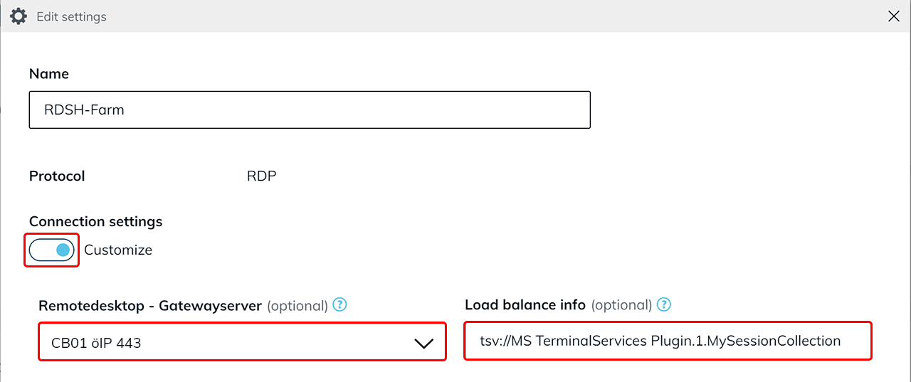 The CB with port 443 must be selected as the Gateway Server. If it is not possible to select the Connection Broker with port 443 at this point, check whether it has been created as a destination in advance (see point 2).