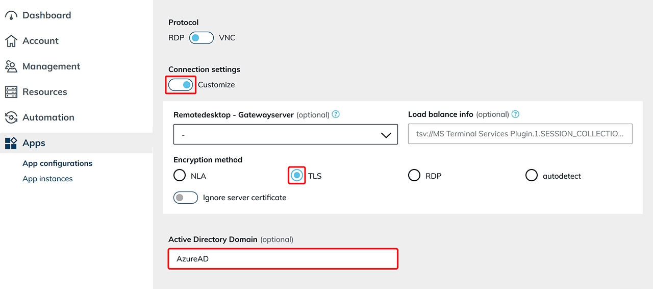 AzureADin the “Active Directory Domain“ field. If left blank, this can be added later in the app instance.