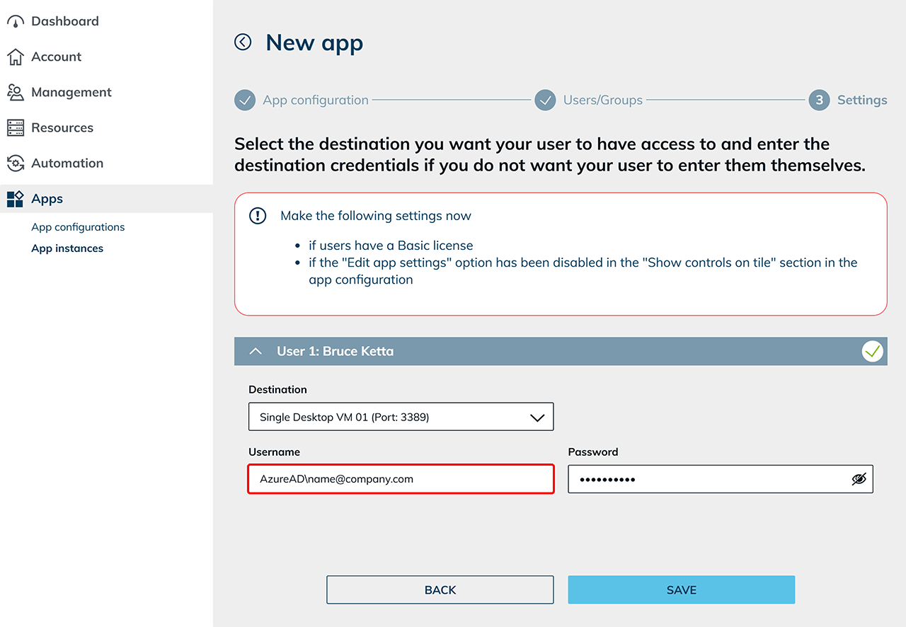 When creating an app instance, in the Settings step, enter the following in the Username field: AzureAD\name@company.com If the domain was already specified during app configuration, only enter the email address here.