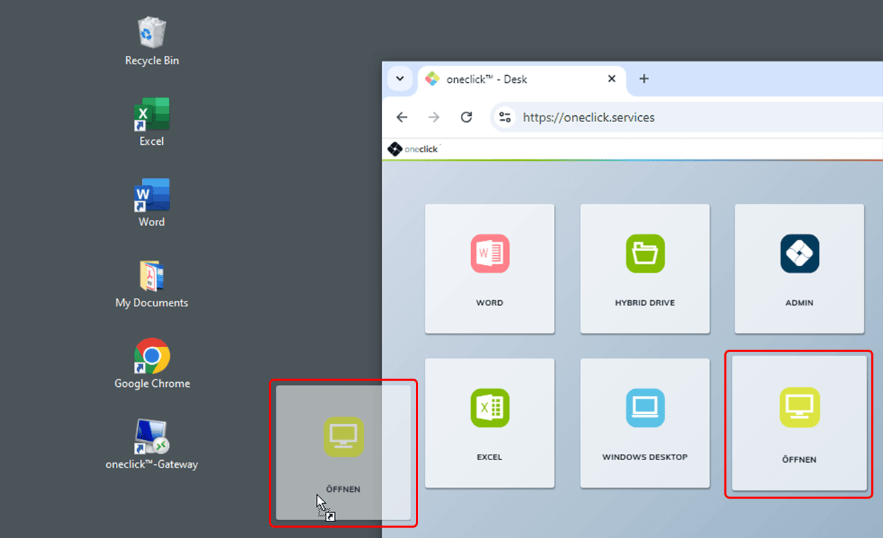 Drag and drop the tile of the oneclick™ access window from the oneclick™ desk to your local desktop. This creates a shortcut that allows you to open the access window directly.