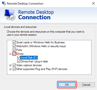 If you want to use your own printer(s) or access files from your local device during the remote session, you need to share these resources in advance.
