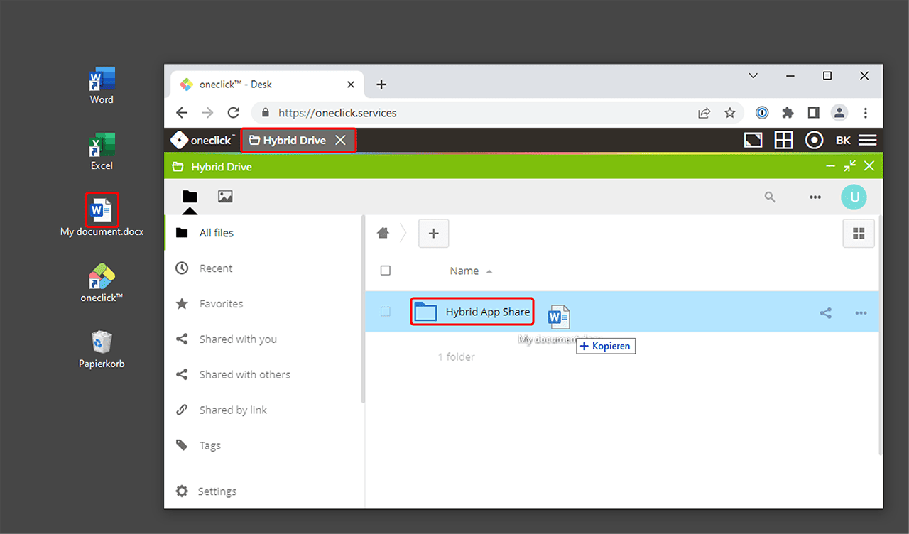 The Hybrid Drive is attached to oneclick™ as a drive on your virtual Windows desktop, designed as a transfer drive (data exchange) via "drag and drop" between a local end device and connected resource.