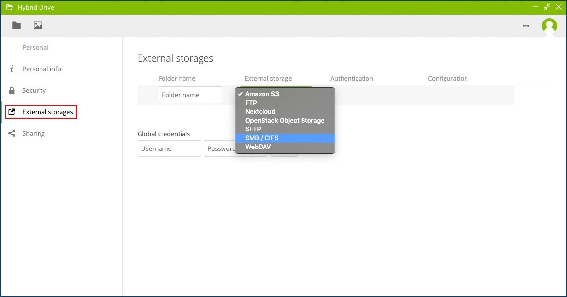 - Click on External storages and select the type of storage from the menu. Find more information about the types of storage here.