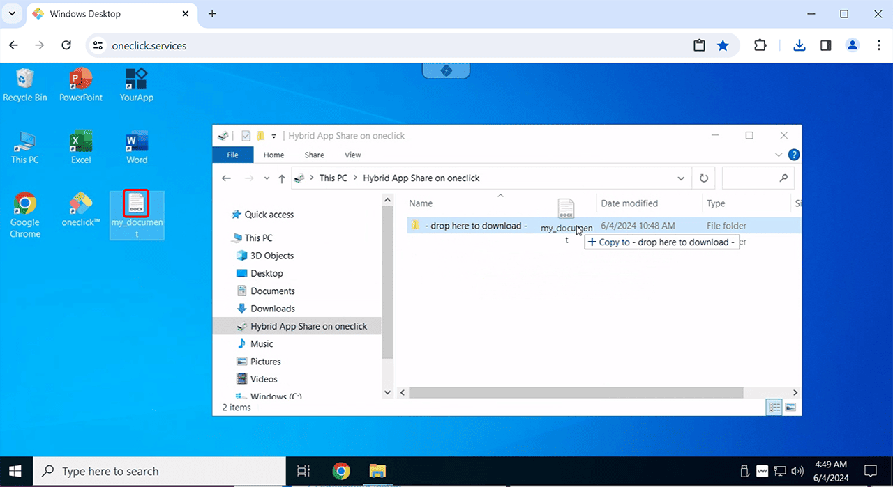 - Open Windows Explorer, select This PC and click on the drive "Hybrid App Share on oneclick".