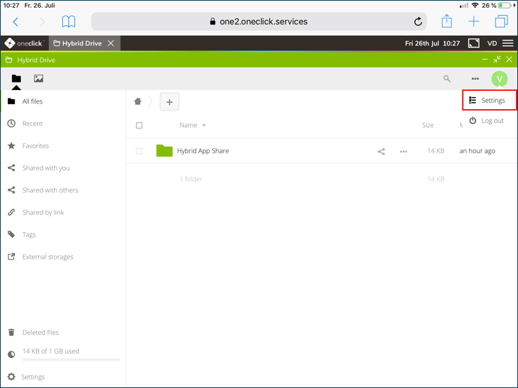 - Open the Hybrid Drive app in oneclick™, go to your profile and click Settings.