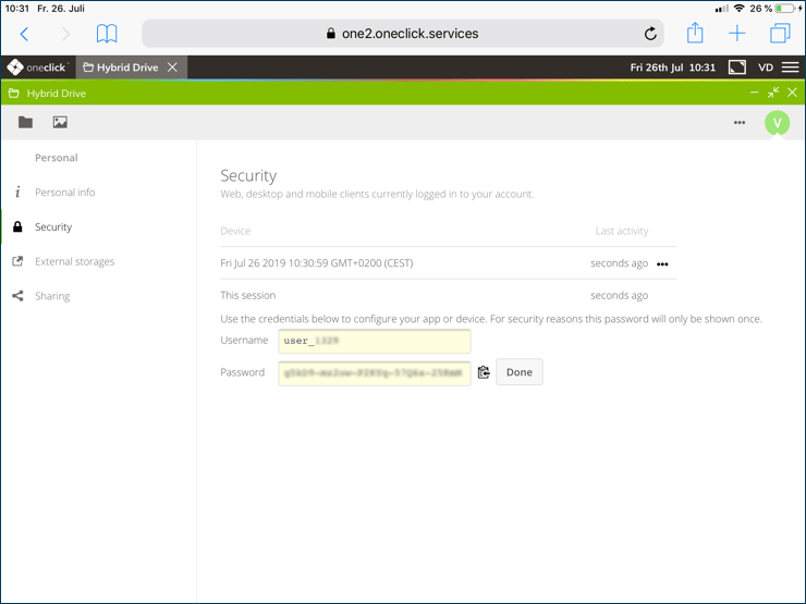 - Switch to the Hybrid Drive app, go to Security and click on Create new app password.