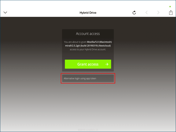 - Switch to the Nextcloud App, enter your login data and click on Grand access. Nextcloud is now connected to your Hybrid Drive in oneclick™. All files you put in the folder "Hybrid App Share" can be accessed within your oneclick™ Windows RDP apps via the drive "Hybrid App Share on oneclick".