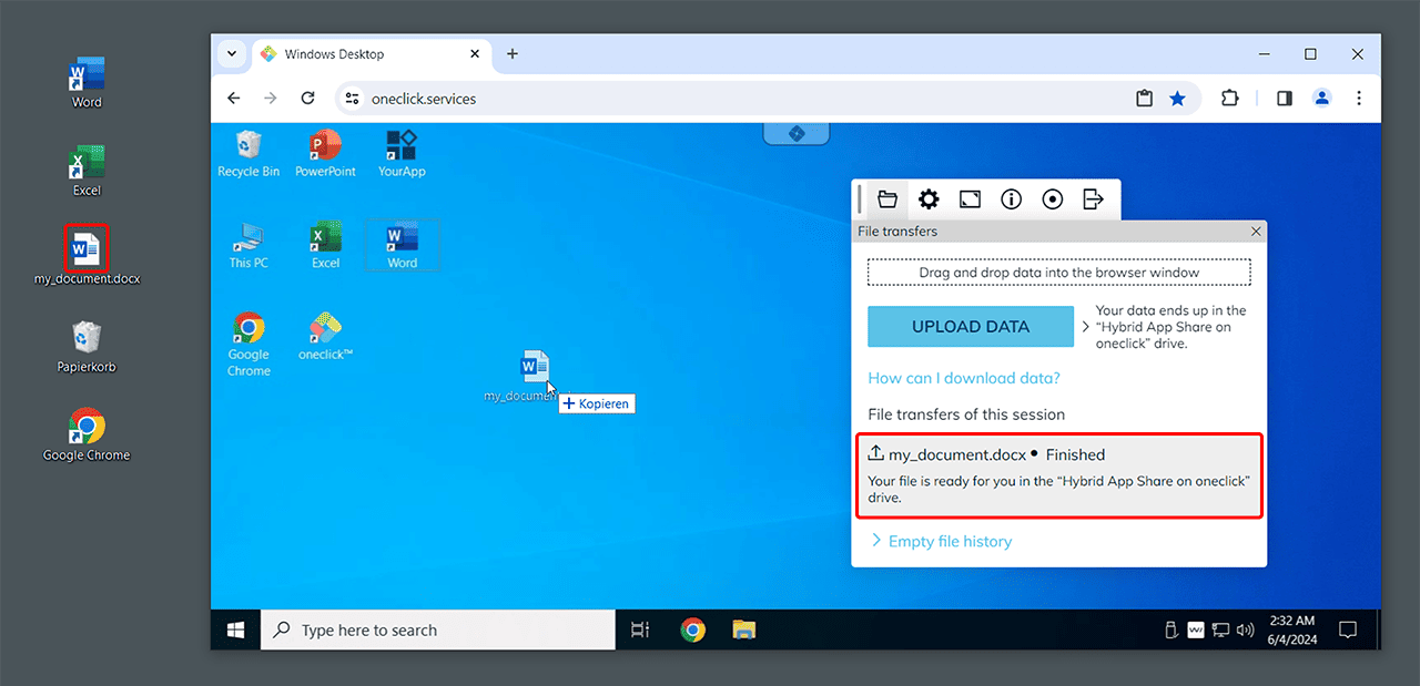 - Drag and drop the desired files from your local device into the app window. All files are automatically stored in the “Hybrid App Share on oneclick” drive/folder.