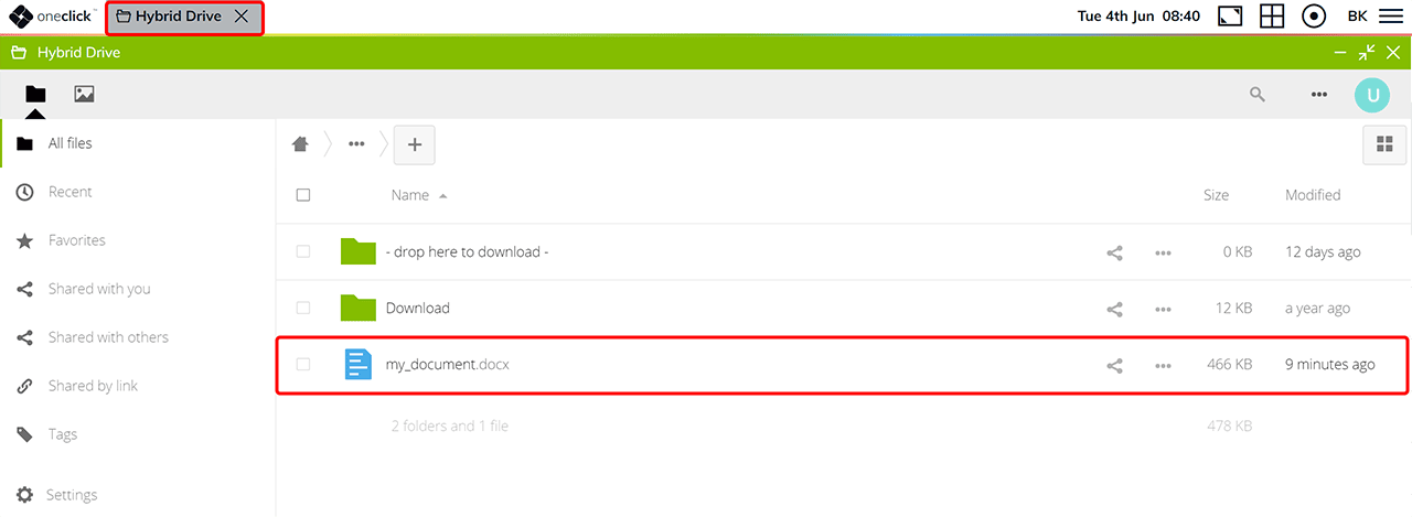 You can also download the files you need directly from the Hybrid Drive app by simply clicking on them without draging them to the download folder.