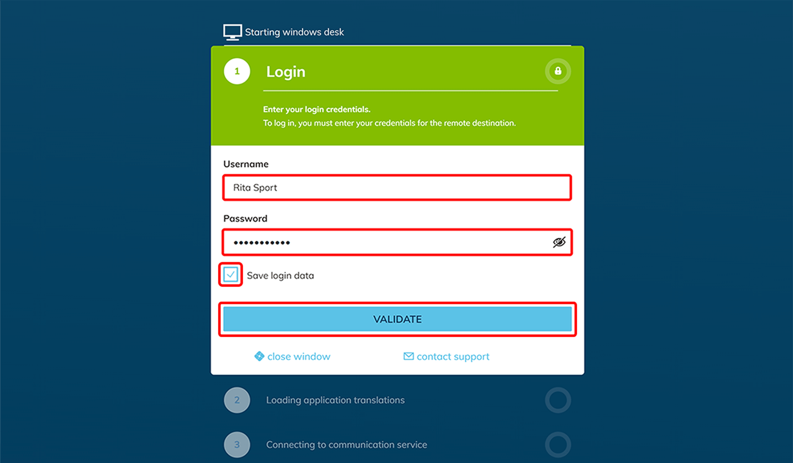 Depending on your administrator’s configuration, you may need to enter your remote system credentials. Optionally select Save login data and click Validate.
