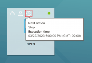 Your administrator can, for example, set the time at which the VM is started or stopped. You can see which action is automatically executed next here.