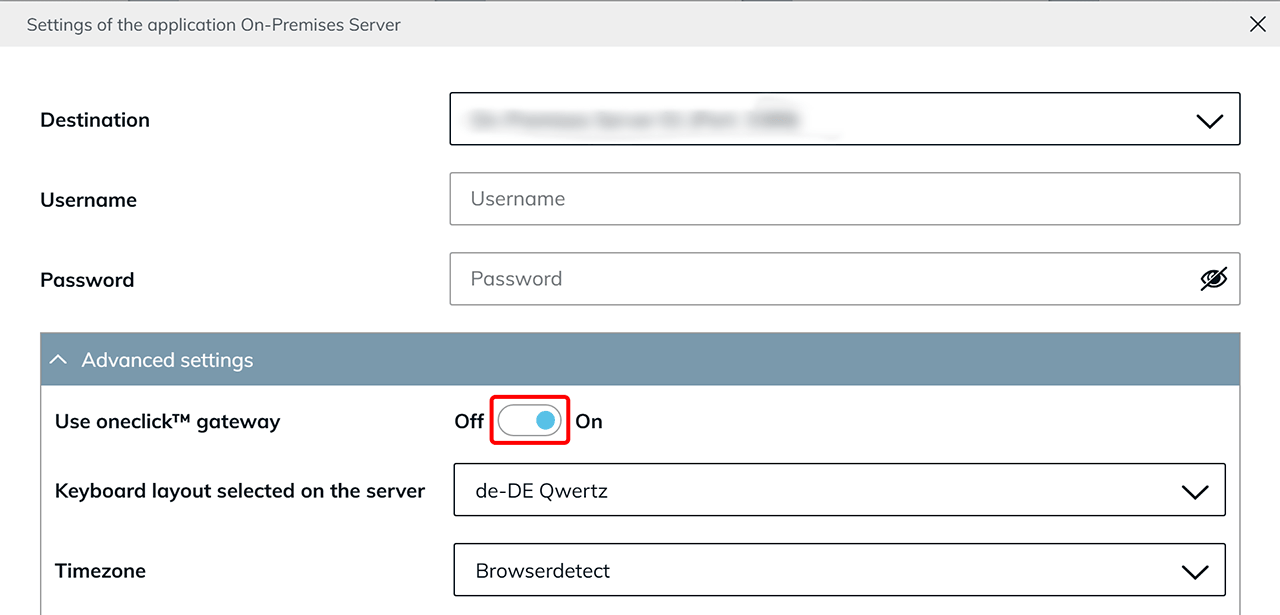 Use oneclick Gateway You may see an additional selection option for the oneclick Gateway under “Advanced Settings”. Whether this option is available depends on the configuration set by your administrator. If the Use oneclick Gateway toggle is visible, you can choose whether the connection is established via the oneclick Gateway or via direct streaming.